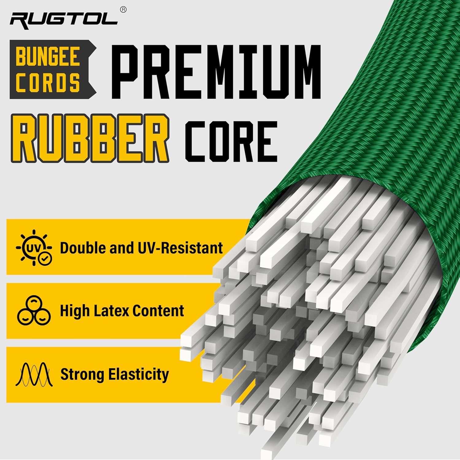 - Super Elasticity and Durability Bungee Cords: Rugtol adjustable green heavy-duty outdoor bungee cords are made from a UV-resistant, high-quality Thai latex and cross-woven rubber blend, offering superior elasticity that stretches up to 1.7x to 2x its original size. Unlike ordinary rubber bungee cords with hooks, these bungee cords maintain flexibility without becoming thin or brittle. The rust-resistant carabiner hooks are made with advanced electrophoretic coating technology.