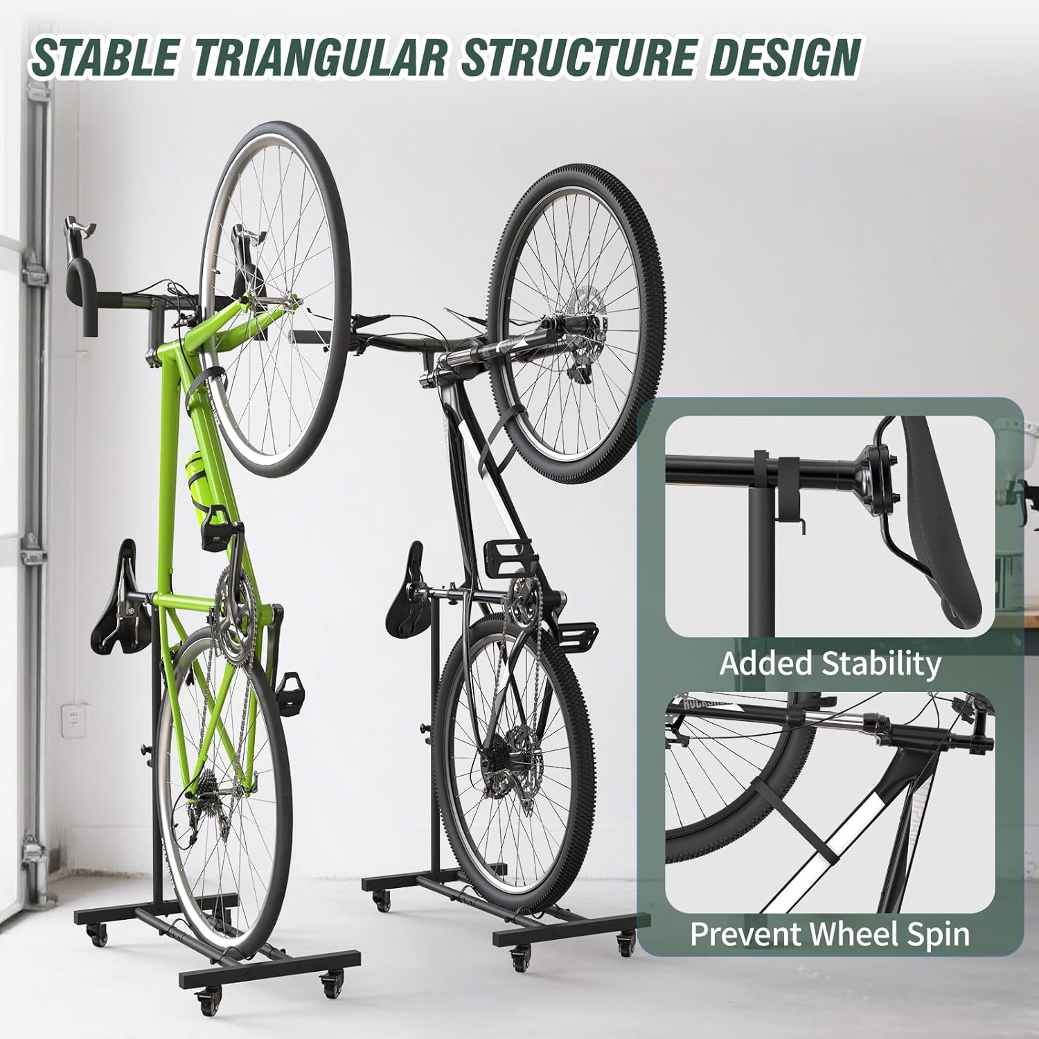 - STURDY CONSTRUCTION: Durable bike storage rack features a premium black powder-coated finish that resists scratches and rust. Its freestanding triangular design provides 4-point contact support, securely holding bikes of various sizes. Built for stability, it effectively prevents tipping and damage.