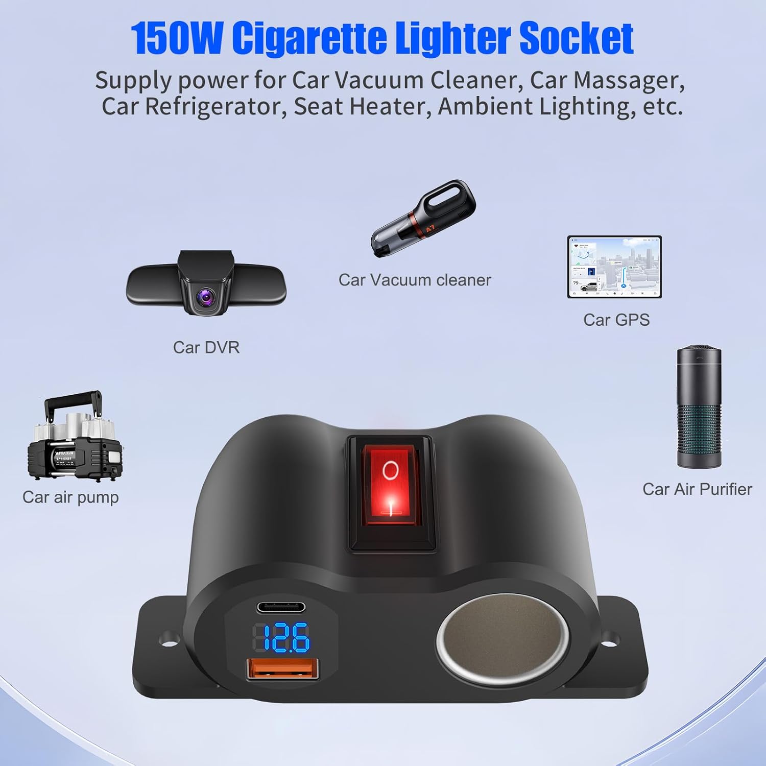 2-in-1 Surface Mount 12V USB Outlet Cigarette Lighter Socket, PD 30W and QC18W Car USB Port Car Charger with Button Switch LED Voltmeter and 120W Socket, Suitable for Cars, Boats, RVs and ATVs