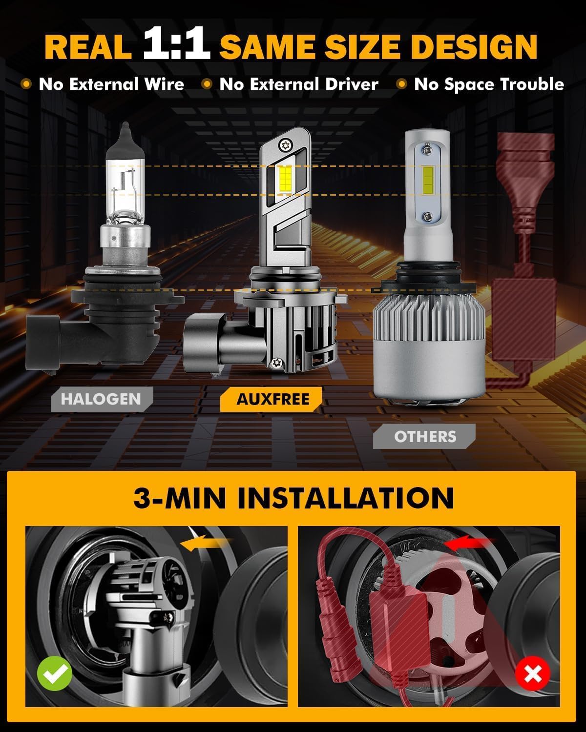 - All-in-one Metal Design: No bulky external drivers & wiring harnesses, No plastic adapter, No plastic plug. Metal Shell from head to toe. Super solid and heavy duty. The 9005 lights fuse stable brightness with good affordability.