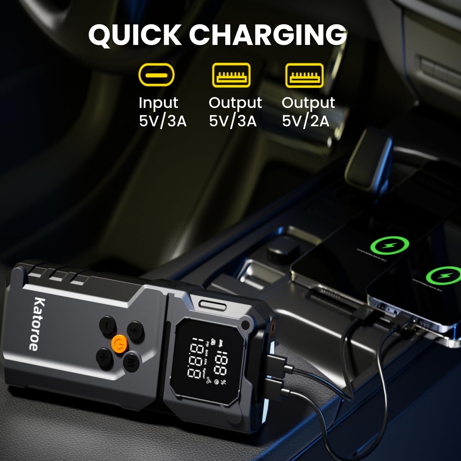 - Cordless Inflator - The car jump starter with air compressor can quickly inflates a car tire from 0 psi to 20 psi in 2 minutes. Equipped with 3 different nozzles & 4 selectable units (PSI, BAR, KPA, KG/cm²) for cars, bicycle, motorcycle, balls etc. The display screen can display the tire pressure in real time, convenient for inflating your vehicle. Get rid of the annoyance of low tire pressure during travel.
