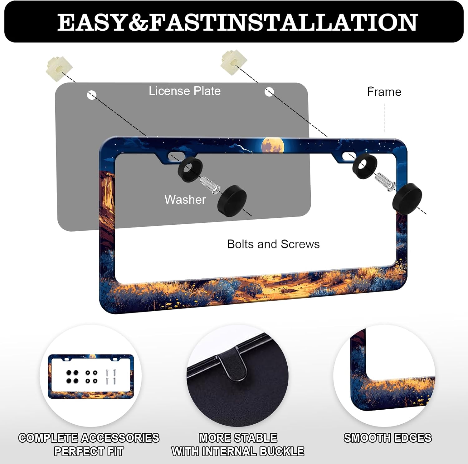Moon License Plate Frames - 2 Pack Starry Sky Moonlight Stainless Steel License Plate Holder,Rust-Proof Waterproof Car Decorative Tag Frame with Screws Fasteners Caps