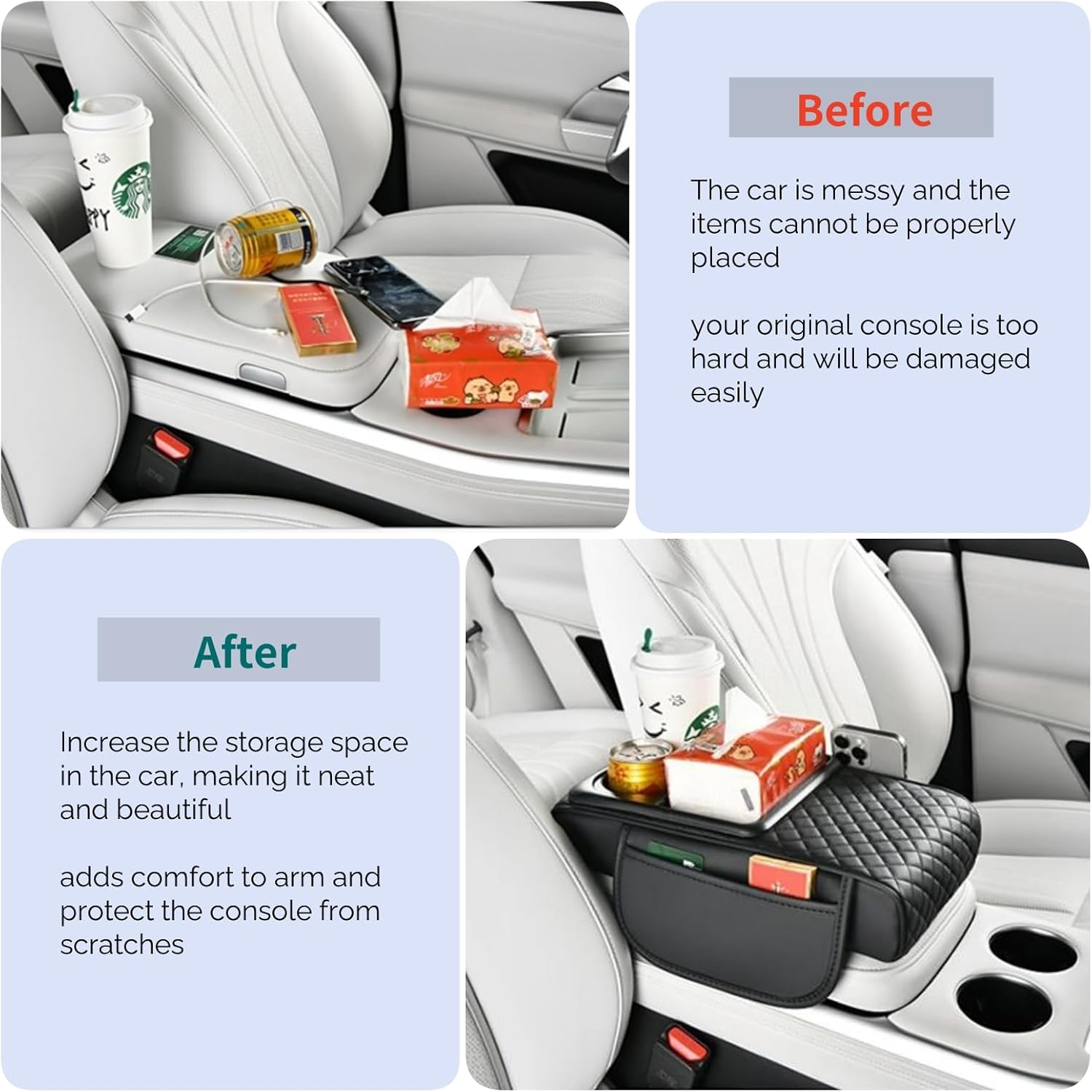 - 【Upgrade Support for Wireless Charging】 Designed with an integrated Built-in 15W charging pad, this car center console cover keeps your phone powered up during long drives, You can put a tissue box when you are not charging. 2 cup holders are available, And one storage pocket on the left and right sides is designed to expand the storage space, Meet the storage needs and store your phone, keys, tissues, ID card, glasses and some other daily small items