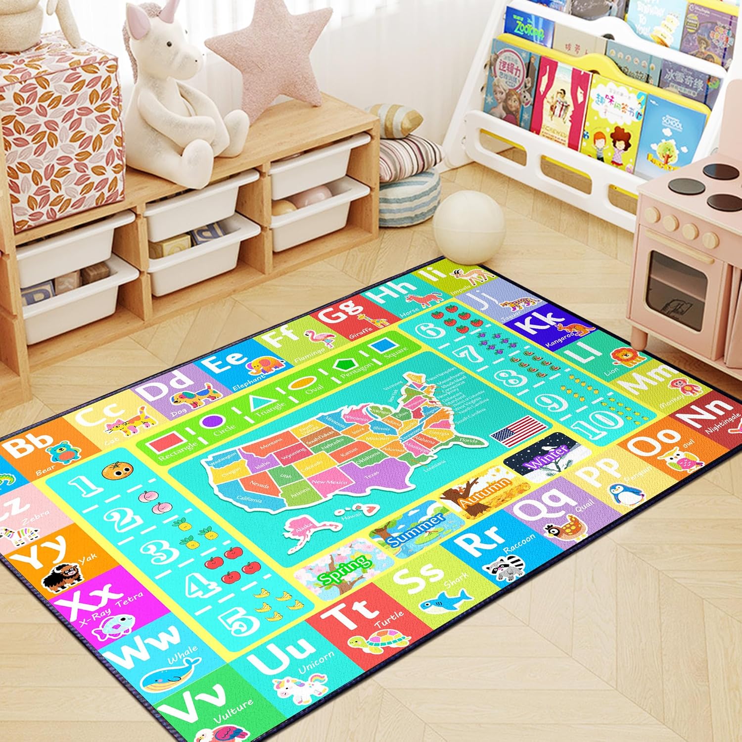 - Educational Elements Galore:Features a colorful US map, ABCs paired with animal illustrations (e.g., Alligator for A), numbers 1 - 10, basic shapes, and seasons. Creates opportunities for kids to explore geography, literacy, numeracy, and seasonal concepts during play.