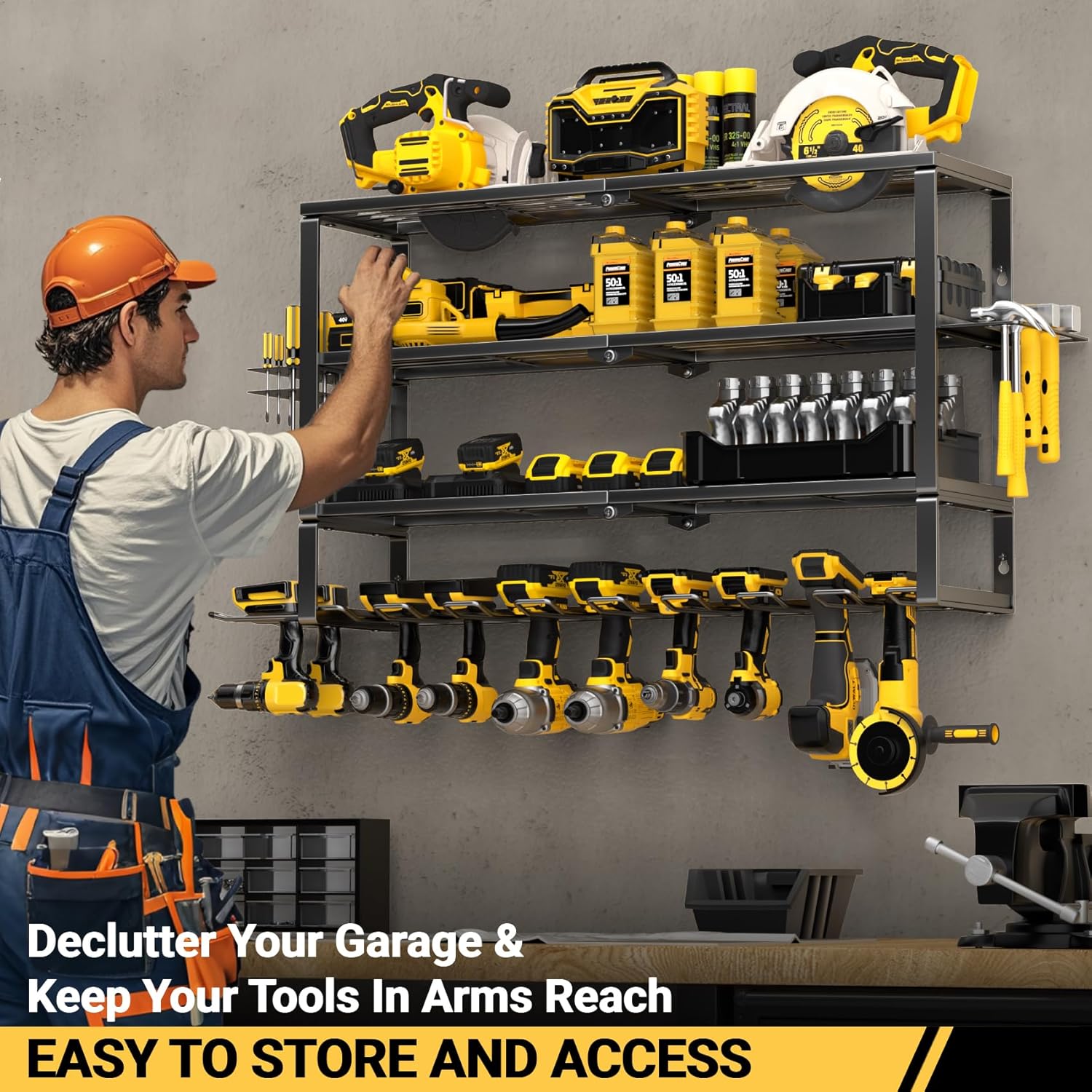 - 【Save Space & Boost Efficiency】Store up to 10 cordless tools on the bottom tier. The 3 top shelves for batteries, chargers, toolboxes, and large power tools. Side slots hold screwdrivers and hammers for quick access. Maximize unused wall space and keep all your tools in one organized, easy-to-reach place.