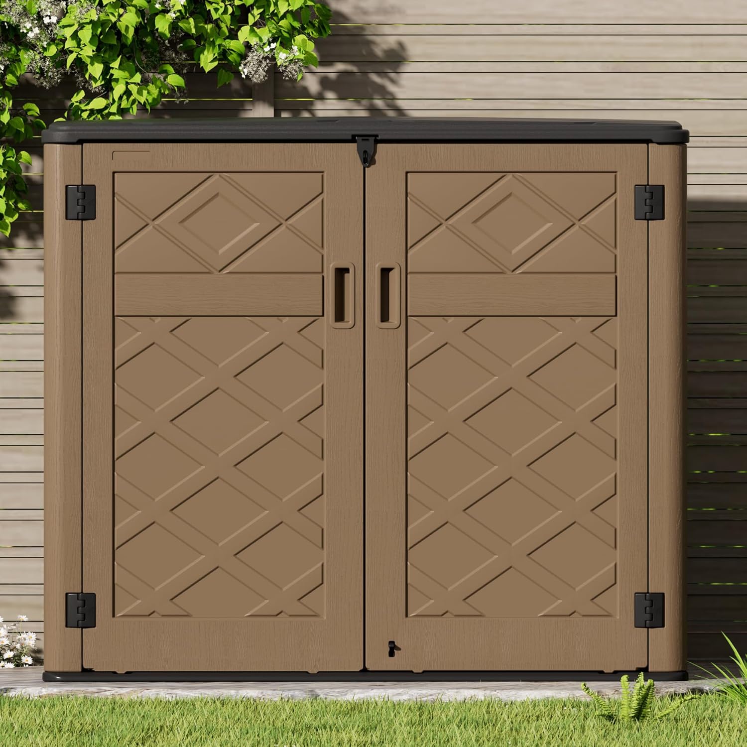 - MULTIPURPOSE SHED: Use as a horizontal storage shed for a lawn mower, generator sheds,bike storage, backyard tools,patio furniture,trash can,etc.