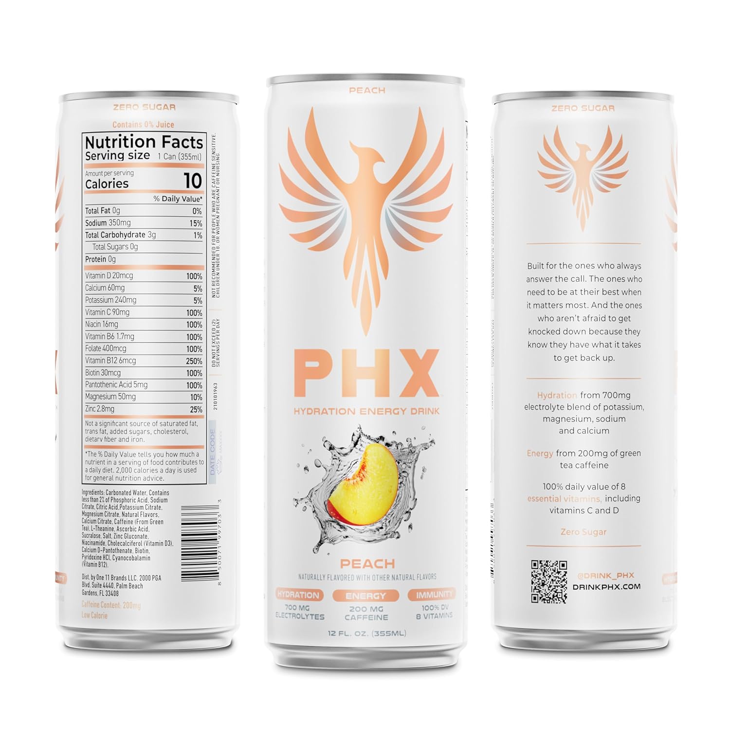 PHX Hydration Energy Drink - 700mg Electrolytes, 200mg Natural Green Tea Caffeine, 100% Daily Value 8 Essential Vitamins - 12 oz Cans (12 Pack) (12 Pack, Peach)