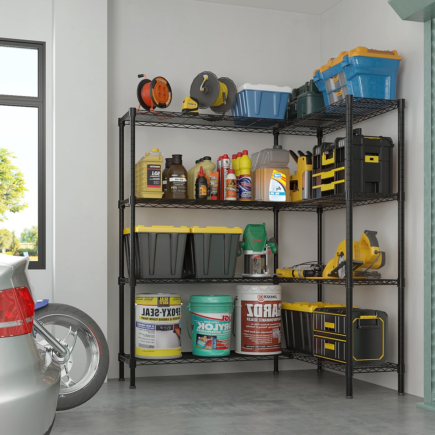 - 【Exceptional 1220 lbs Load - Bearing】Constructed with a dense grid steel frame and reinforced metal supports, this garage shelving is more stable and durable than ordinary racks. With a single - shelf capacity of 305 lbs and a total load - bearing of 1220 lbs, it is rock - solid.