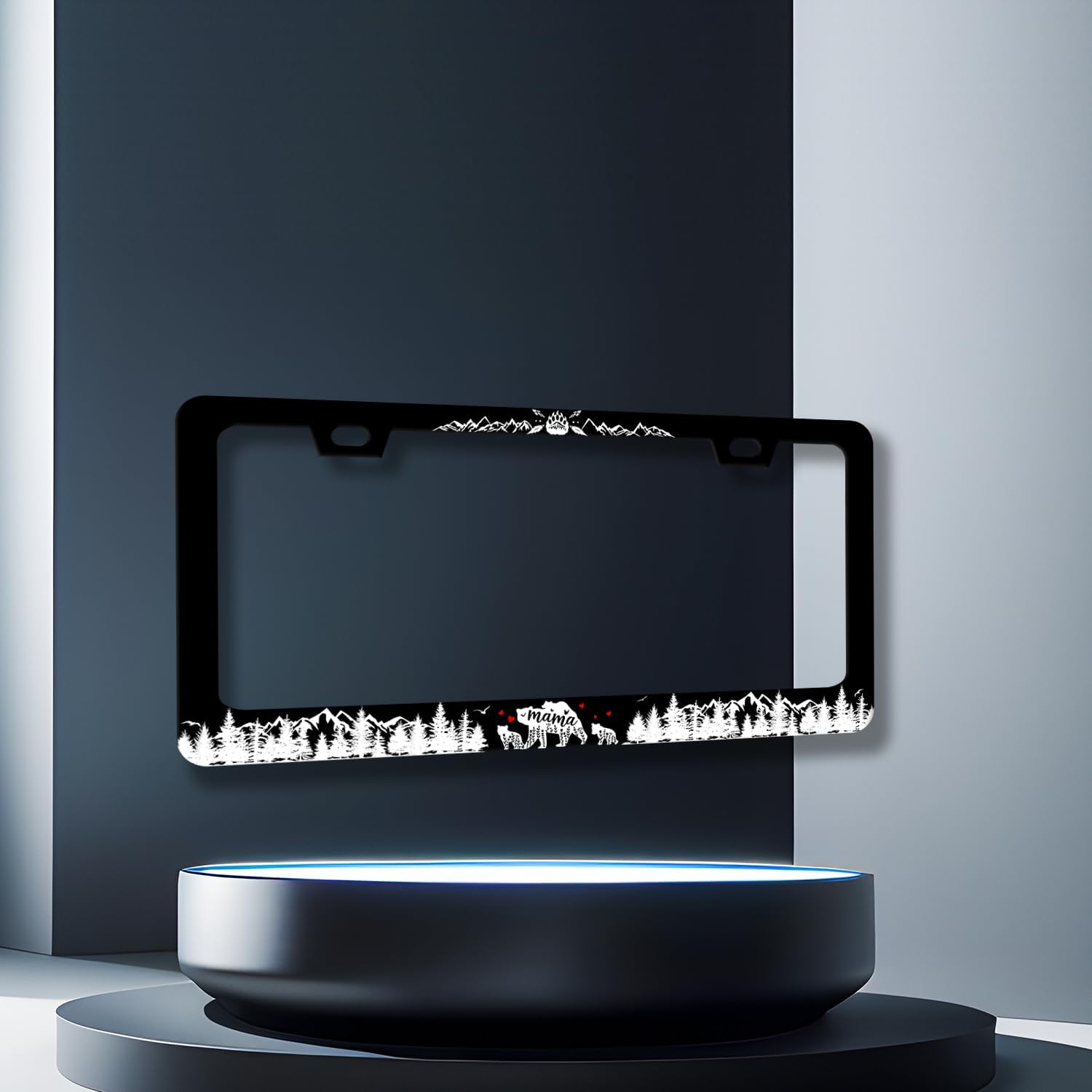 Mama Bear with Mountain License Plate Frame Forest Mountains License Plate Stainless Steel Funny Black Accessories Cars Decor 12.2 X 6.2 Inch with 2 Holes and Screws Fits Standard Us Ca Vehicles