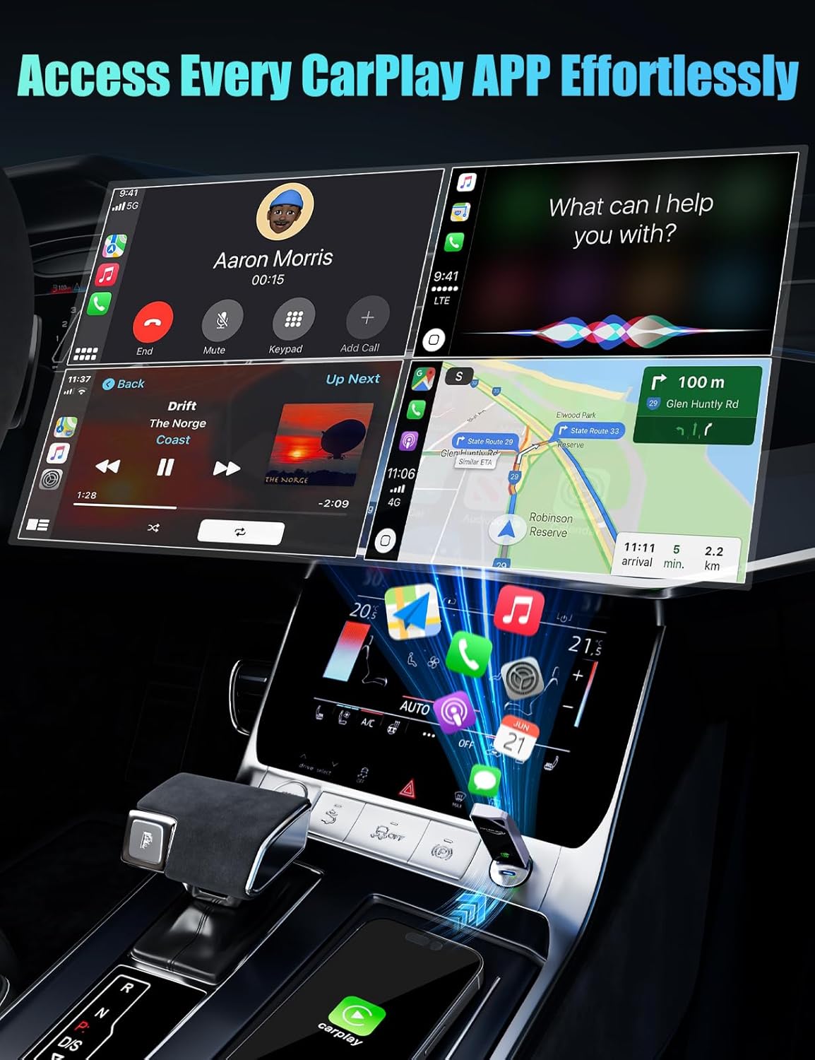 - 【Seamless Wireless CarPlay Upgrade】Convert your car’s wired CarPlay to wireless in seconds. Enjoy lag-free navigation, music streaming, Siri voice control, and seamless calling/texting. Access every CarPlay app effortlessly via Siri commands, touchscreen taps, steering wheel buttons, or central console knobs.