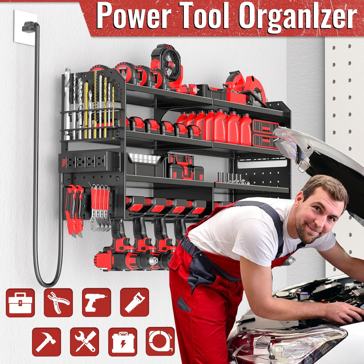 - 4 Layer Tool Storage Rack: This Power Tool Organizer with power strip features 2 side drill bit racks, 4 shelves, 8 drill slots, and an 1 four-outlet power strip, making it your all-in-one solution. From power tool accessories to workshop essentials, there's room for everything you need to stay organized and productive.