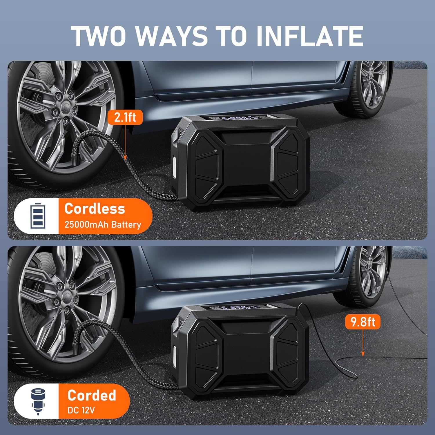 - Large Capacity Battery & 12V DC Dual Power: This cordless car tire inflator offers dual power. It can be powered by a powerful battery for wireless operation, or you can use the cigarette lighter to inflate. With a USB-C input and a USB-A output port, it lets you recharge your phone, tablet, or laptop.
