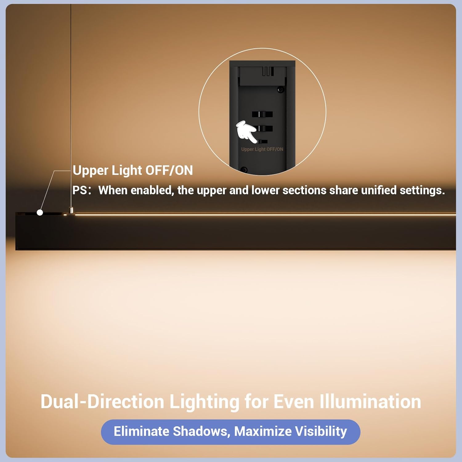 - DIRECT AND INDIRECT LIGHT:LED linear light fixture is innovated with 100/90/80/70/60W down light and 100/90/80/70/60W up light. The down light provides sleek focused lighting and the up light creates a nice ambiance and reduce eye fatigue, perfect for office, work bench, work shop, garage, gym, school, exhibition, bar,and even pool tables.