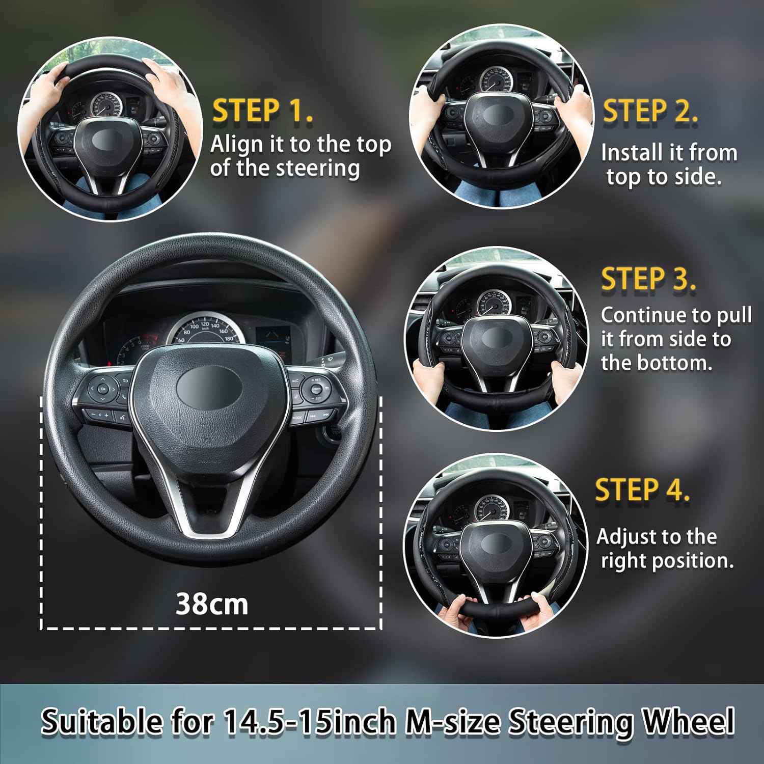 - Fits 98% of Models: The car steering wheel cover is suitable for standard M-size steering wheels from 14 1/2 to 15 inches. If you feel it's difficult to put it on, please use a hair dryer to heat it for about 3 minutes to soften the inner rubber