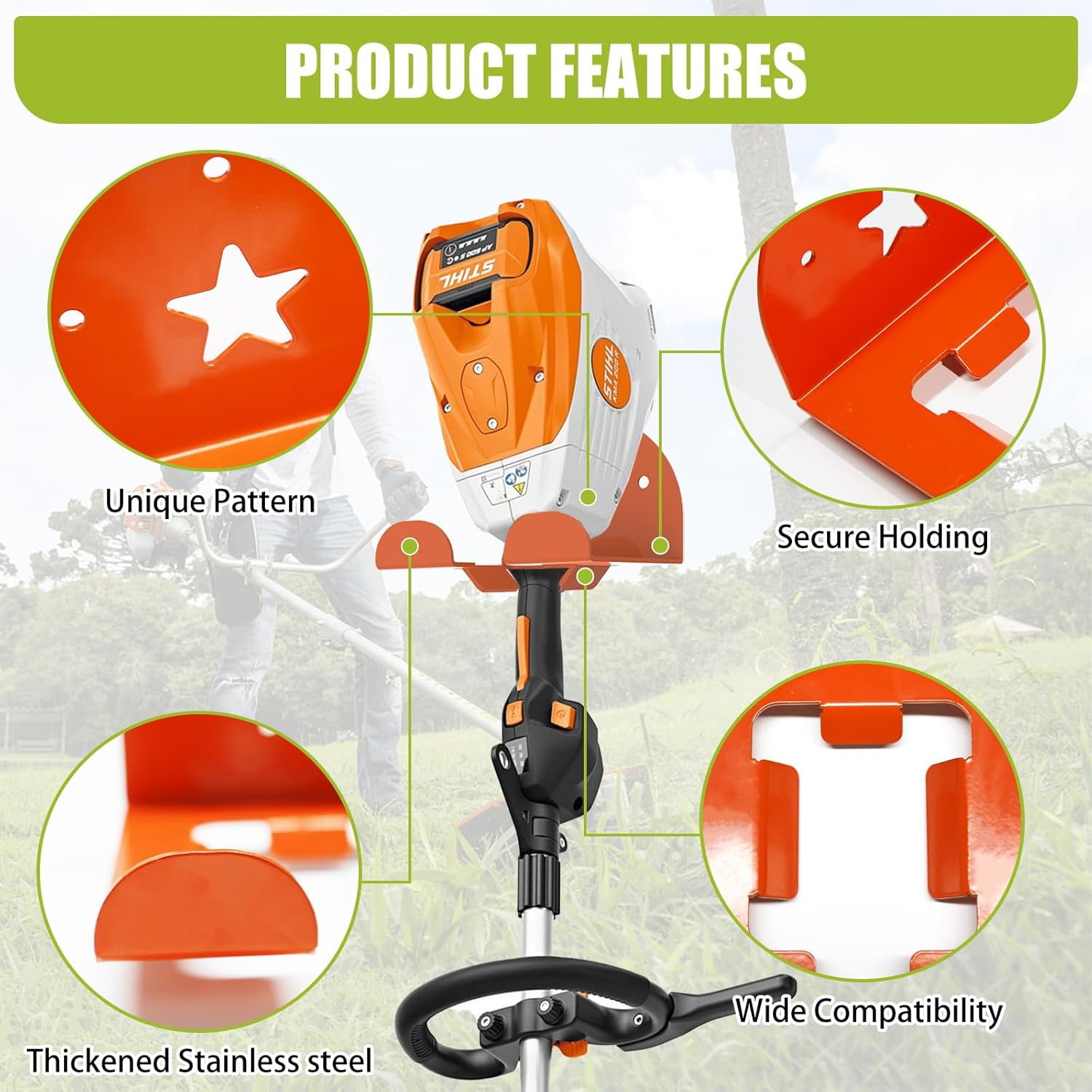 - 【Heavy Duty】The trimmer rack is made of alloy steel(300LB load capacity),which can stably hold your equipment. Each bracket features a durable orange powder coating and is paired with accessories coated in a black anti-rust layer, easily withstanding harsh environments such as humid garages and windy, rainy gardens, while providing water and rust resistance.