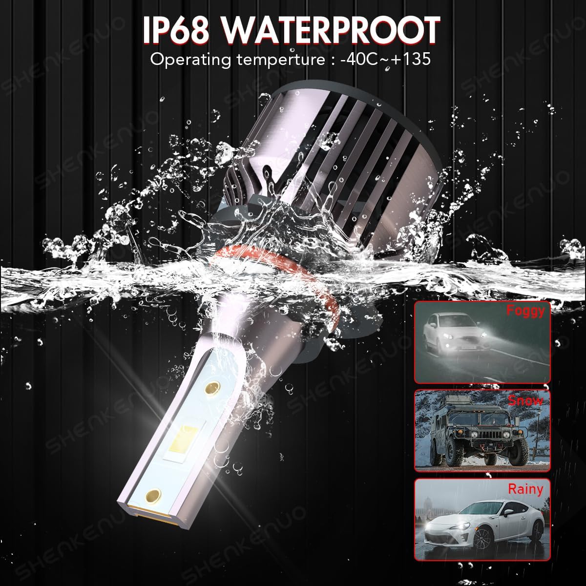 - [Waterproof and dustproof,durable and reliable]:Adopting IP68 waterproof and dustproof design,the car lights can easily cope with various harsh environments,such as rain,snow,muddy roads,etc. The sturdy casing and high-quality cooling system ensure stability and reliability even after long-term use,safeguarding your every journey