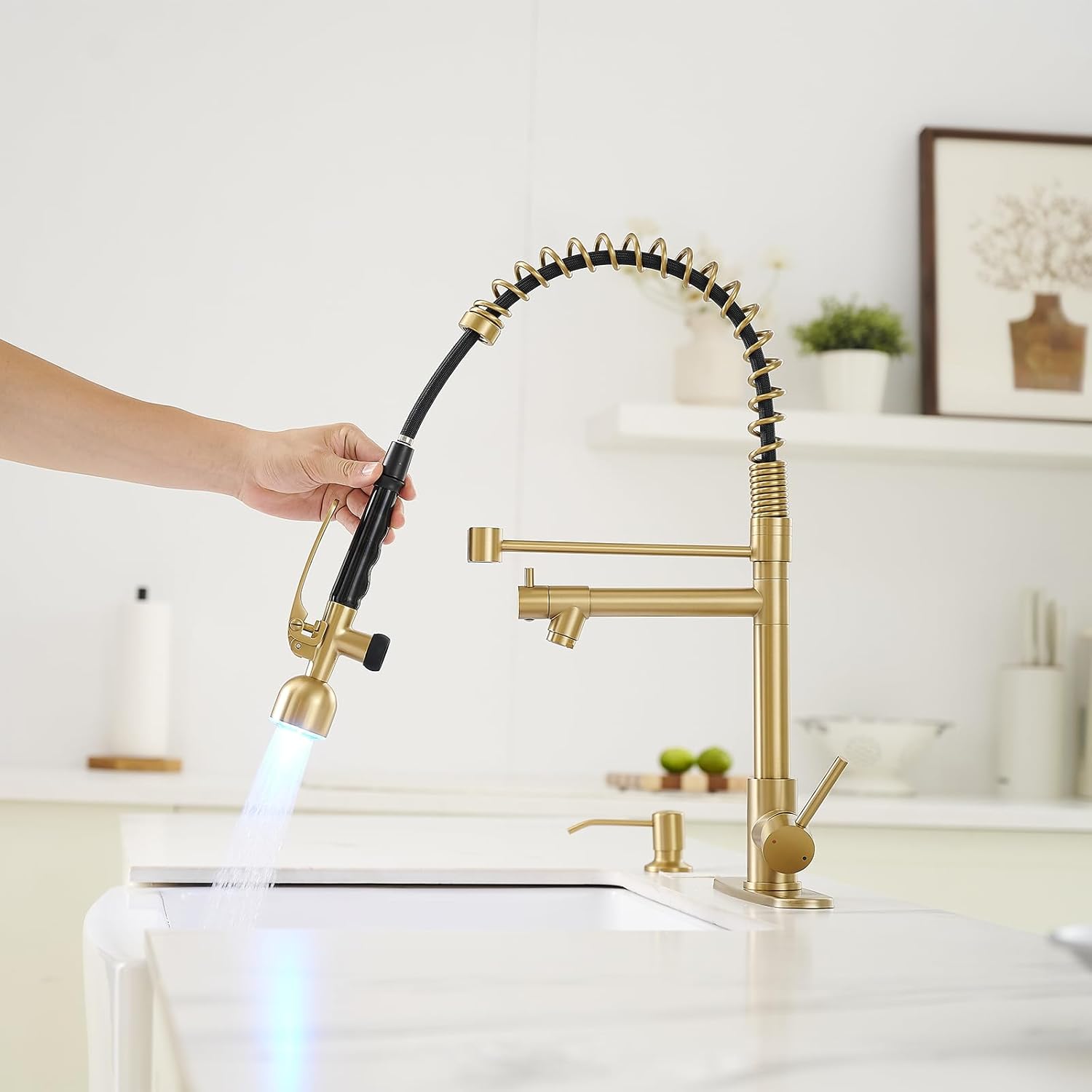 Fapully Commercial Kitchen Faucets with Pull Down Sprayer Brushed Gold LED Single Handle Faucet for Kitchen Sink, Kitchen Faucet with Soap Dispenser and Deck Plack for 4 Hole