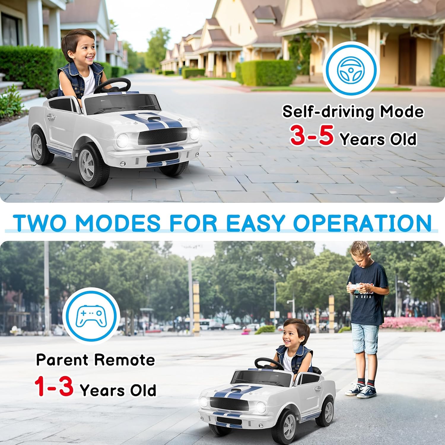 - 2 Control Methods - Kids electric car supports pedal operation and remote control operation. Pedal operation supports 2 speed switching, and remote control operation supports 3 speed switching, which improves the safety of children