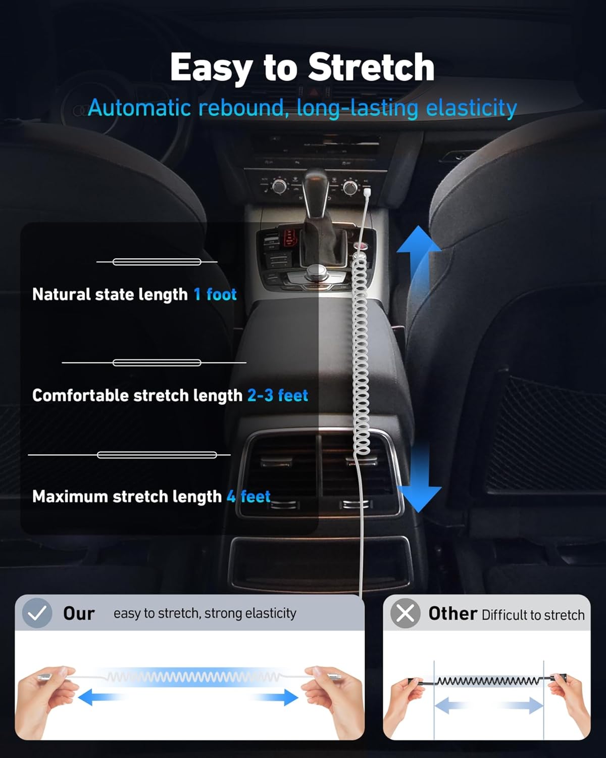 - Stretchable Length and High Flexibility: The natural length is 1 foot, the maximum stretch length is 4 feet, and the comfortable use length is stretched to 2-3 feet; The natural length is 1.5 foot, the maximum stretch length is 6 feet, and the comfortable use length is stretched to 2-5 feet, automatically rebounding to the natural state when not in use. The braided cable is made of high-quality nylon, which has better flexibility, wear resistance, easy stretching, fast rebound, and long-lasting elasticity.