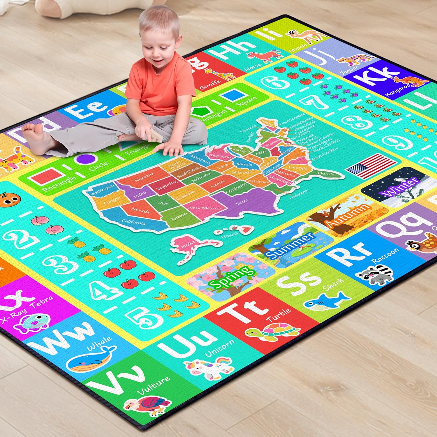 - Educational Elements Galore:Features a colorful US map, ABCs paired with animal illustrations (e.g., Alligator for A), numbers 1 - 10, basic shapes, and seasons. Creates opportunities for kids to explore geography, literacy, numeracy, and seasonal concepts during play.