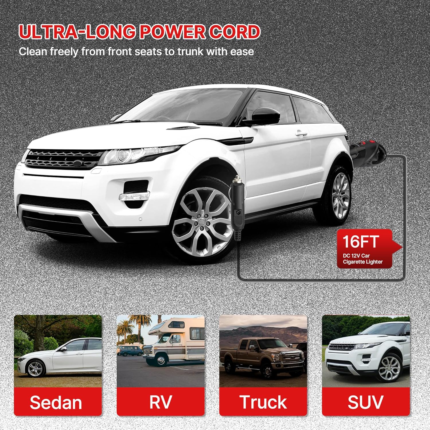 - Easy Plug & Go: Simply plug into your carโs 12V cigarette lighter socket and start cleaning instantly. The 16ft extra-long power cord reaches every corner of your vehicle, from trunk to dashboard, without unplugging.