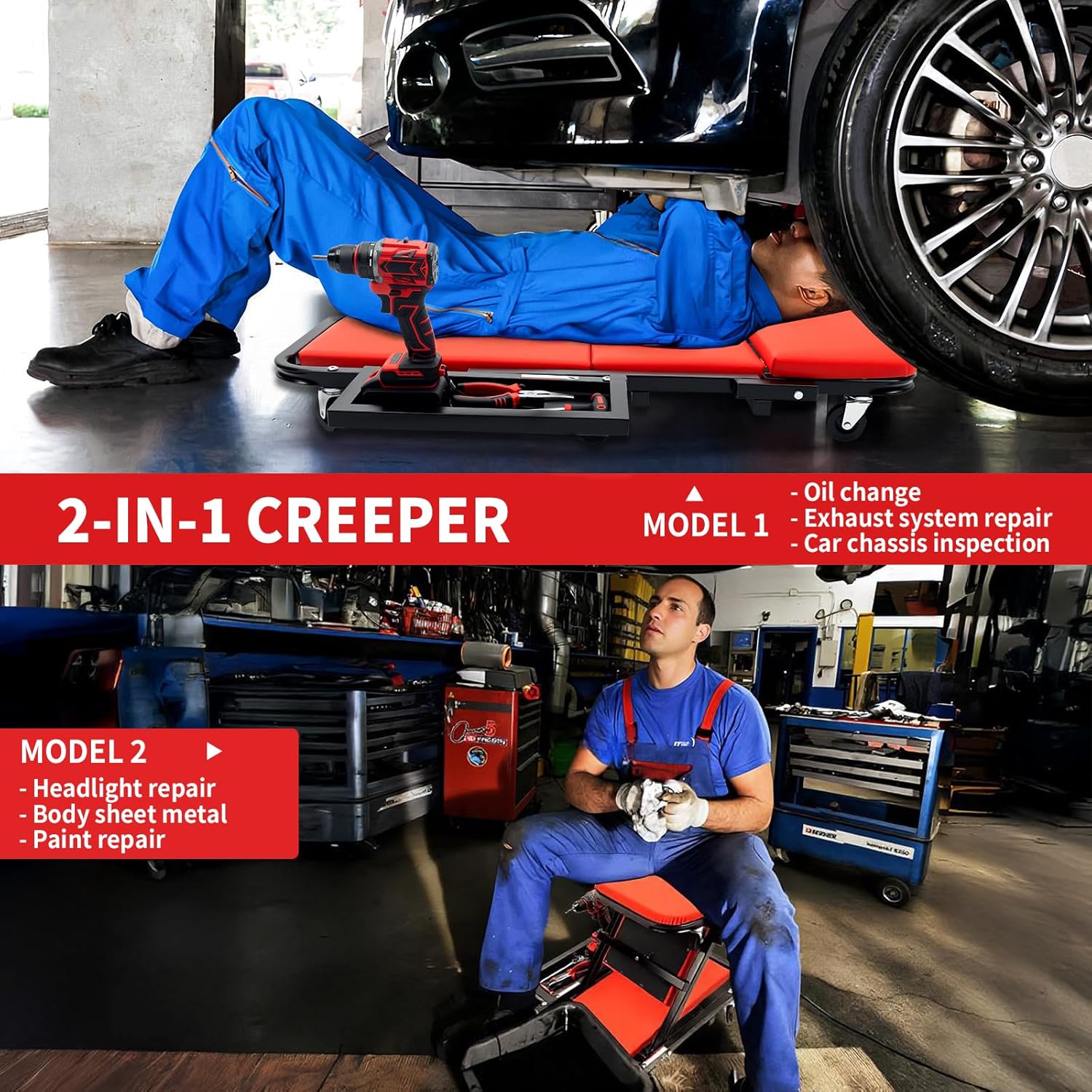 - 2-in-1 Modes - Easily switch between sitting and lying modes with a simple pull of the pin, accommodating different work needs. The tool tray keeps your tools within easy reach.