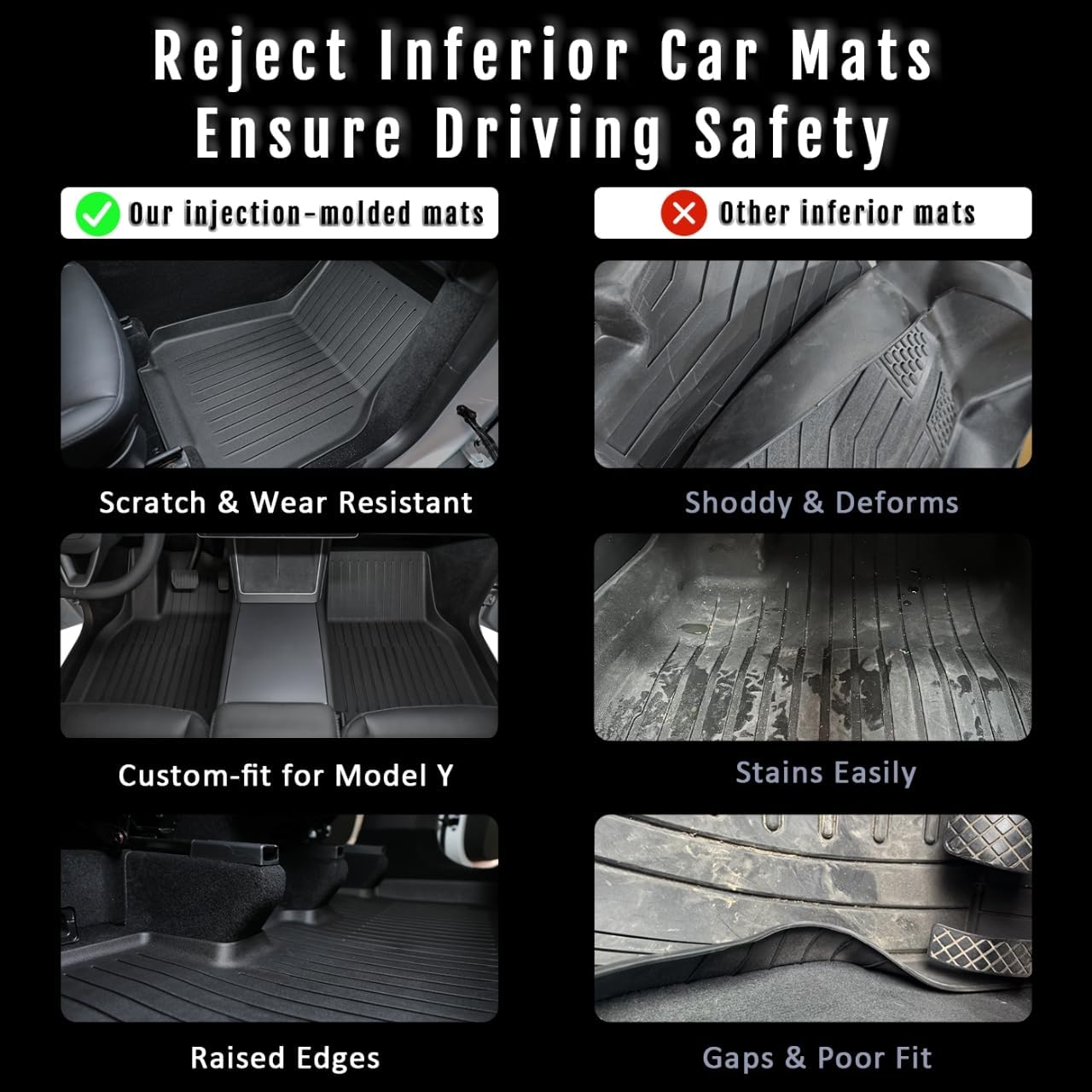 - 🌿 Eco-TPE: Non-Toxic & Odorless Safety : Crafted from all-natural TPE material (0% PVC/phthalates), these Tesla Model Y Juniper floor mats are non-toxic and odorless, caring for you and your family's health. Babies can also use them with peace of mind, even in hot cars. Brathe easy knowing these all weather floor mats offer comfortable and skin-friendly safety.